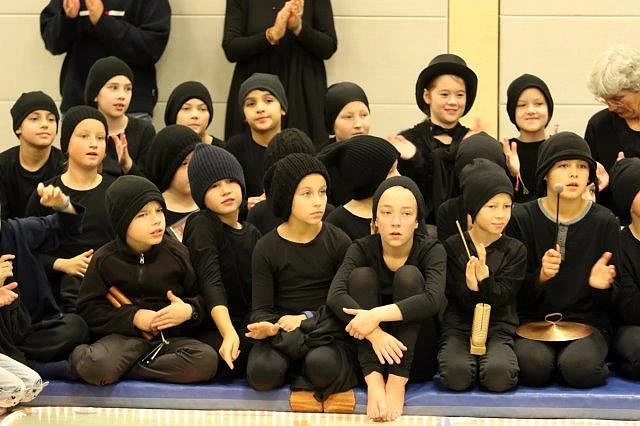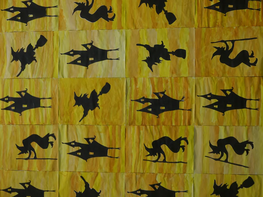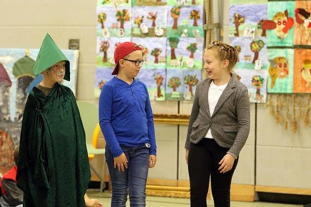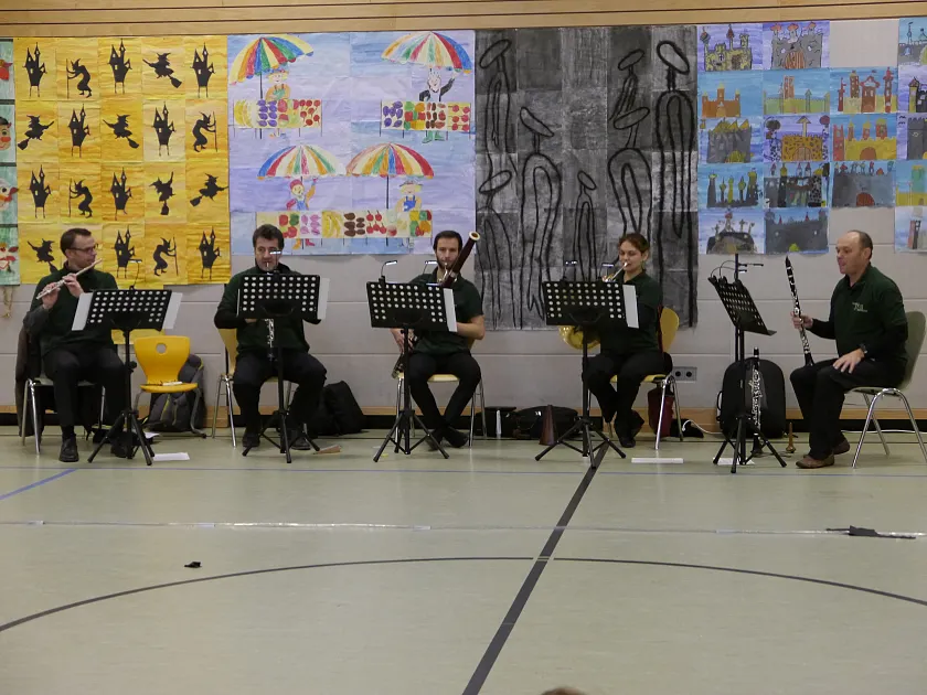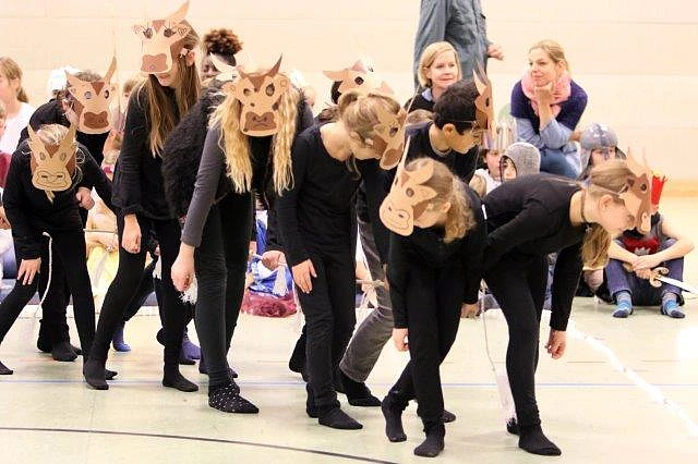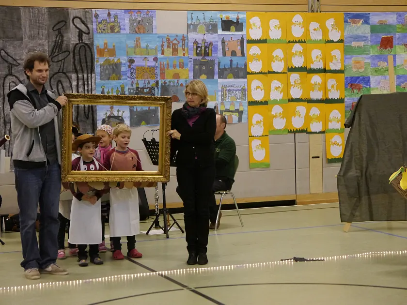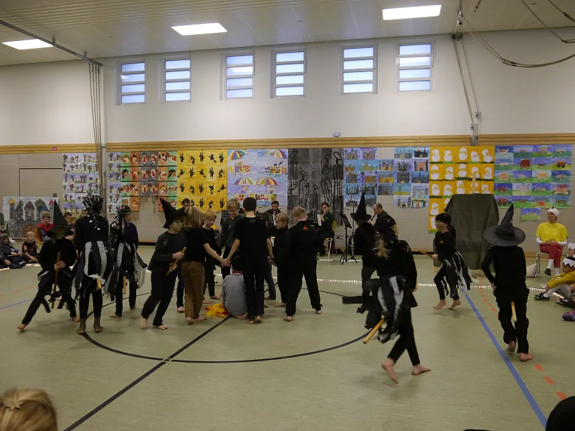 Zunächst führte die 2b "Der Gnom" auf, in dem sie einen Tanz einstudiert hatten und als Gnome und Bäume verkleidet waren. "Das alte Schloss" wurde von der 3b dargestellt, die eine alte Schlossszene und Ritterkämpfe nachspielten. Kinder der 2a stellten fröhlich spielende Kinder in einem Park dar, mit denen sie das Gemälde "Tuilerien" beschrieben. Einen schweren Ochsenkarren hatte die 4a im gleichnamigen Gemälde "Ochsenkarren" zu ziehen. Danach kam ein Tanz der 1b, die mit ihren Küken-Kostümen den "Tanz der Küken in ihren Eierschalen" darstellten. In "Die Hütte der Baba Yaga" wurde von der Klasse 3a ein Hexenmahl gebruzelt. Anschließend gabt es ein Marktgeschrei der Klasse 1a, die den "Marktplatz von Limoges" wiederspiegelten. Zum Abschluss wurde es gruselig und die 4b ließ die Toten aus den "Katakomben" wieder auferstehen.