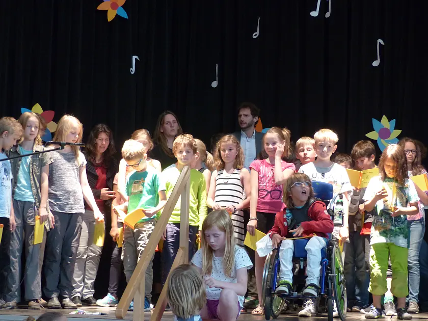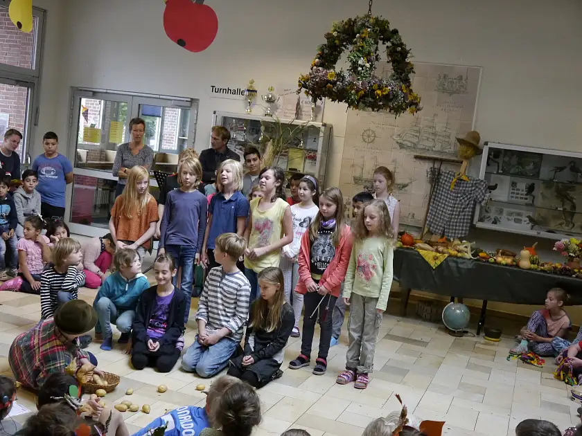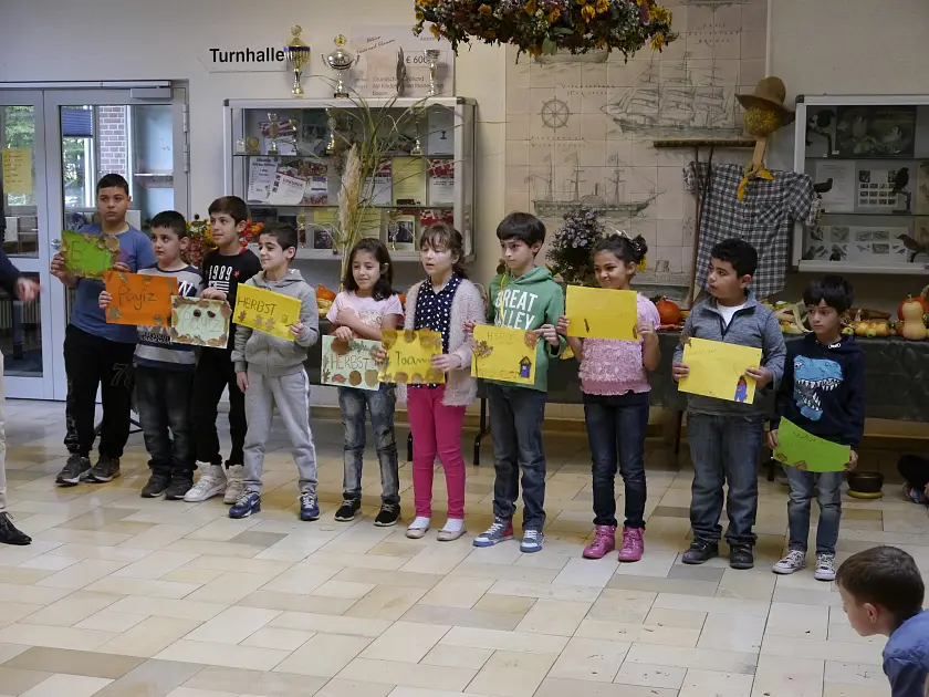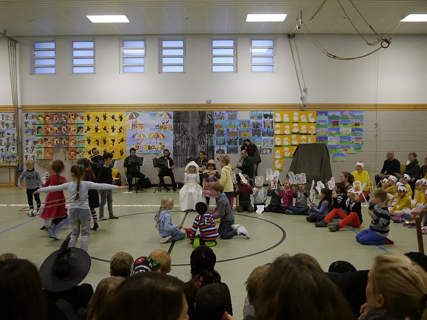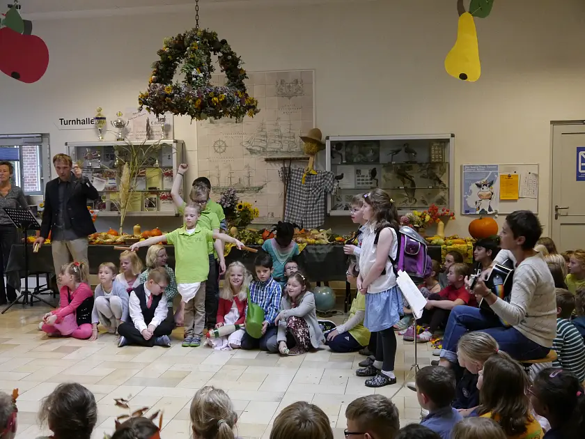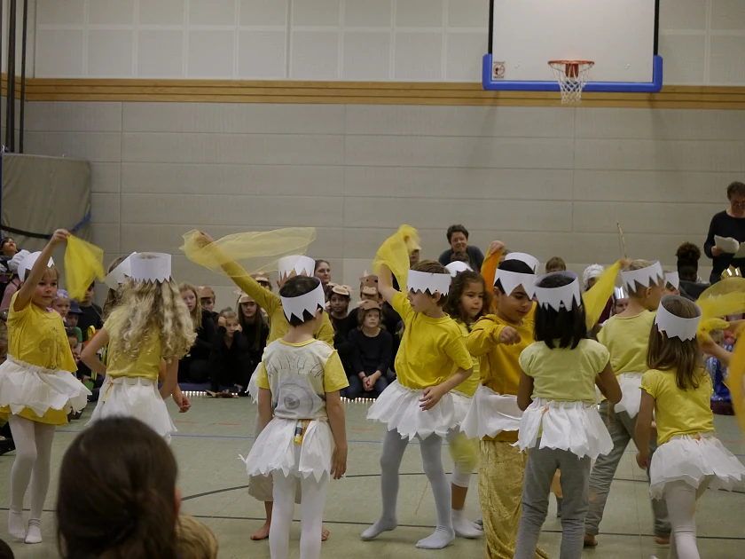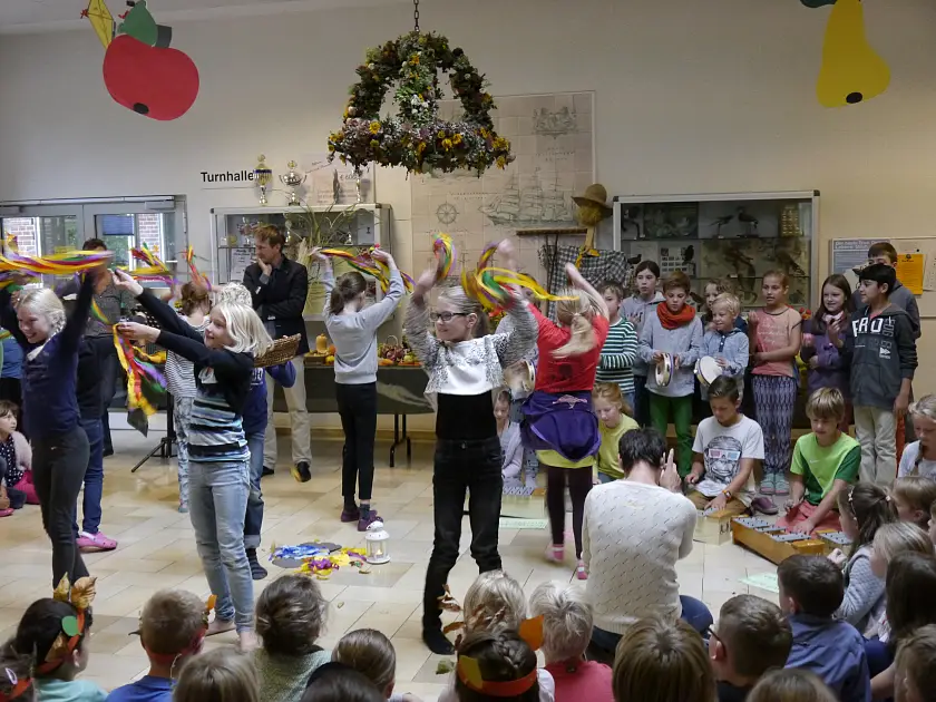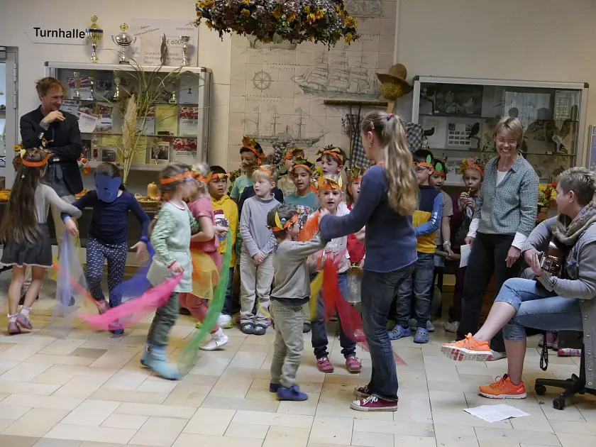 Die Moderation übernahm Herr Mack aus der 3a. Er führte durch das bunte Programm. Jede Klasse hatte Gedichte, Lieder oder Tänze zum Herbst vorbereitet. Zwischendurch wurden immer wieder gemeinsame Lieder mit allen gesungen, wie z. B. "Der Sommer muss gehen" oder "Was im Garten leuchtet".