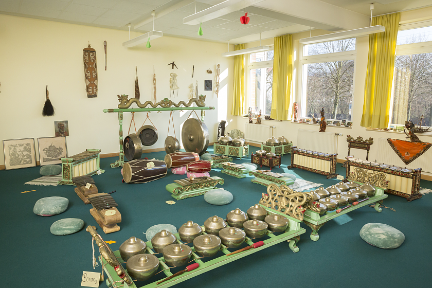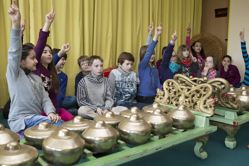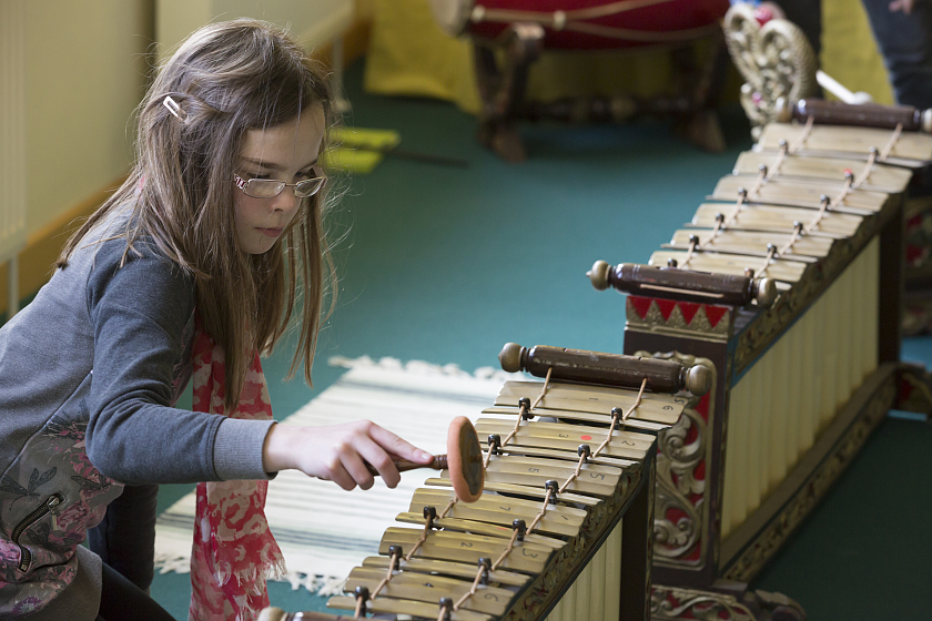 Wir erlebten einen spannenden Workshop mit Bodypercussion und Rhythmusübungen mit Sticks und Tomtoms. Anschließend lernten wir ein original indonesisches Gamelanorchester kennen, in dem jeder von uns gleich mitspielen konnte und in den ganz besonderen Klang dieser Instrumente eintauchen konnte.