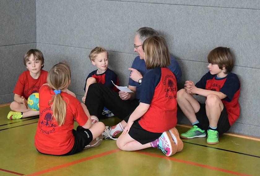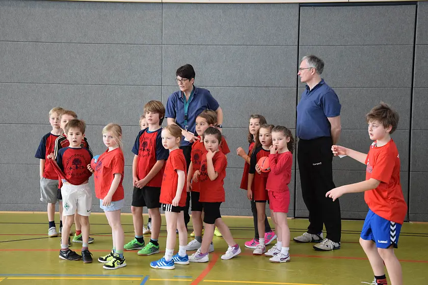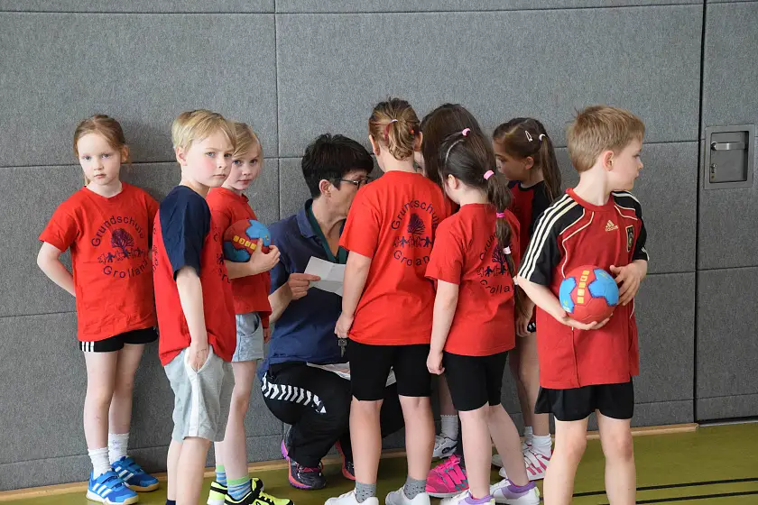 Die Spielfeste der Handball-Minis finden unter altersentsprechenden Bedingungen statt: kleinere Spielfelder, weniger Spieler auf dem Feld, niedrigere Tore. Die Grollander Schule nahm mit einem Mini- (= Anfänger) und einem Maxi-Team (= Fortgeschrittene) in Pusdorf teil. Selbst bei der geringen Trainingszeit von nur einer Schulstunde in der Woche brauchten sie den Vergleich mit den anderen Vereinsteams nicht zu scheuen!
