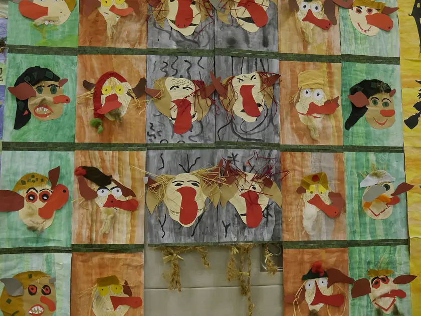 Bunte Vogelmasken wurden von den Kindern gebastelt.
