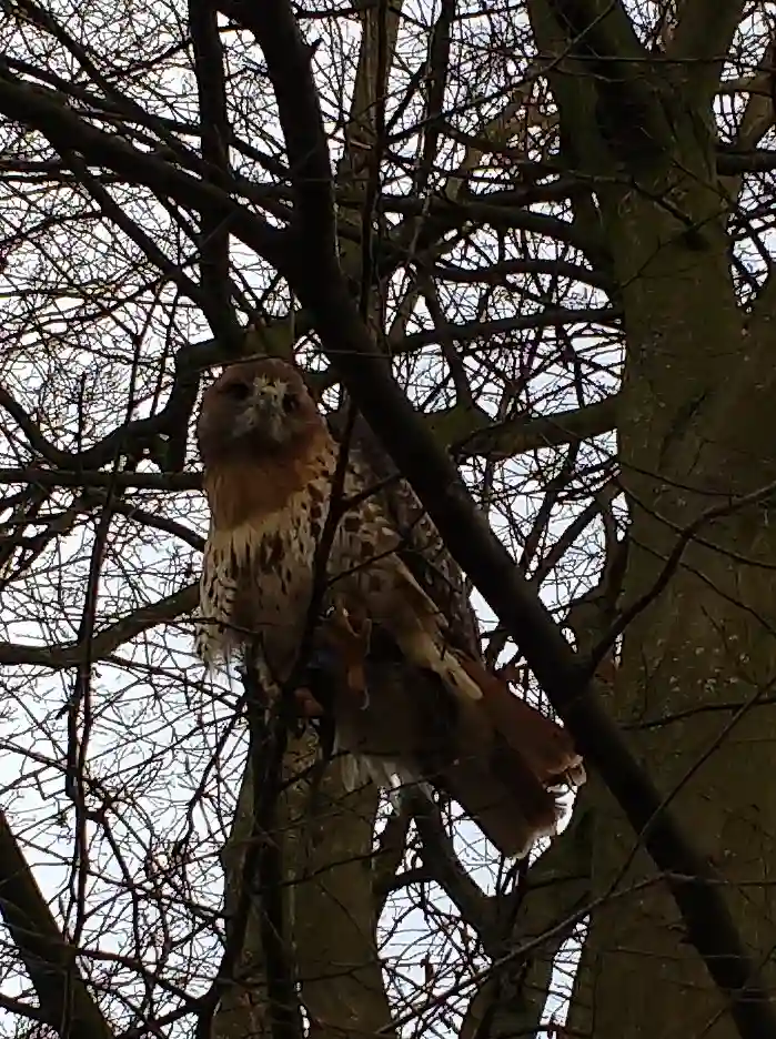Er saß ganz ruhig auf dem Baum über dem Gatter für Laub- und Gartenabfälle und er wirkte erschöpft. An einem Ring und etwas Blauem am Fuß konnten wir eindeutig erkennen, dass es ein registriertes Tier war und ich hatte gerade überlegt, ob er überhaupt noch die Kraft zum Fliegen hat, als er Richtung Schulwiese davonflog.