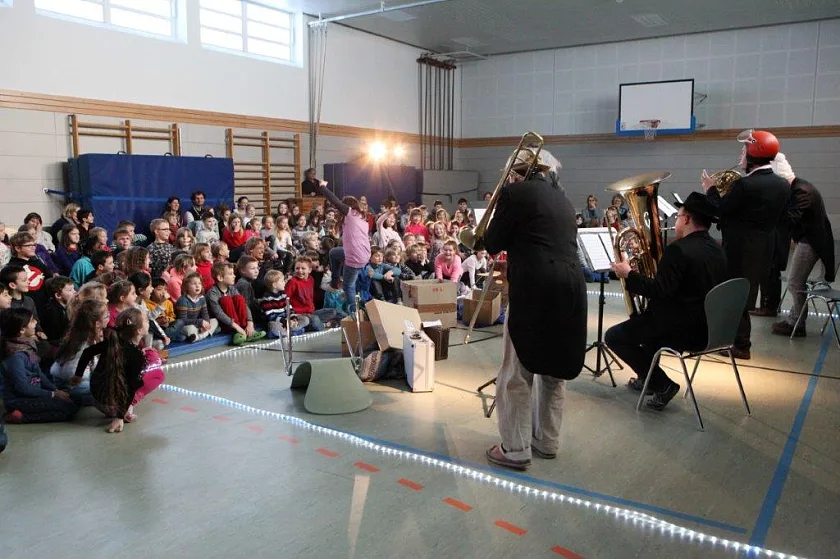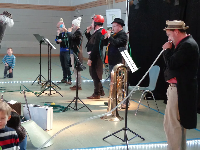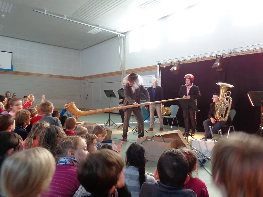 Dieses kleine Schulkonzert hatten wir am 17.02.2016 zu Besuch in der Grundschule Grolland. Professor Zweistein, dargestellt von dem Schauspieler Sebastian Kautz, sorgt mit seiner zerstreuten, aber neugierigen Art für die richtige Mischung aus Unterhaltung und Information. In dem Stück lässt er sich ausführlich die verschiedenen Blechblasinstumente von den Blechgeistern erklären und erlebt, dass die sogar mit Hilfe von Gartenschläuchen und alten Trichtern wunderbare Melodien zaubern können.
