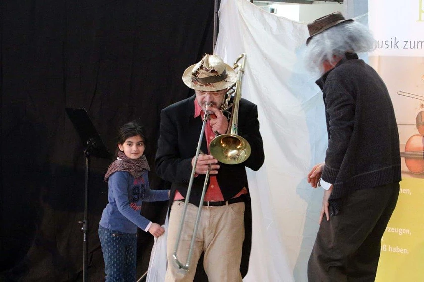 Dort vor Ort wurde man von einem bunten Rahmenprogramm empfangen. Man konnte sich schminken lassen, Buttons herstellen, Trompeten aus Gartenschläuchen basteln und verschiedenste Musikinstrumente ausprobieren. Auch Professor Zweistein war wieder mit von der Partie und viele bekannte Gesichter aus unseren zahlreichen Musikprojekten.