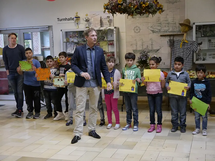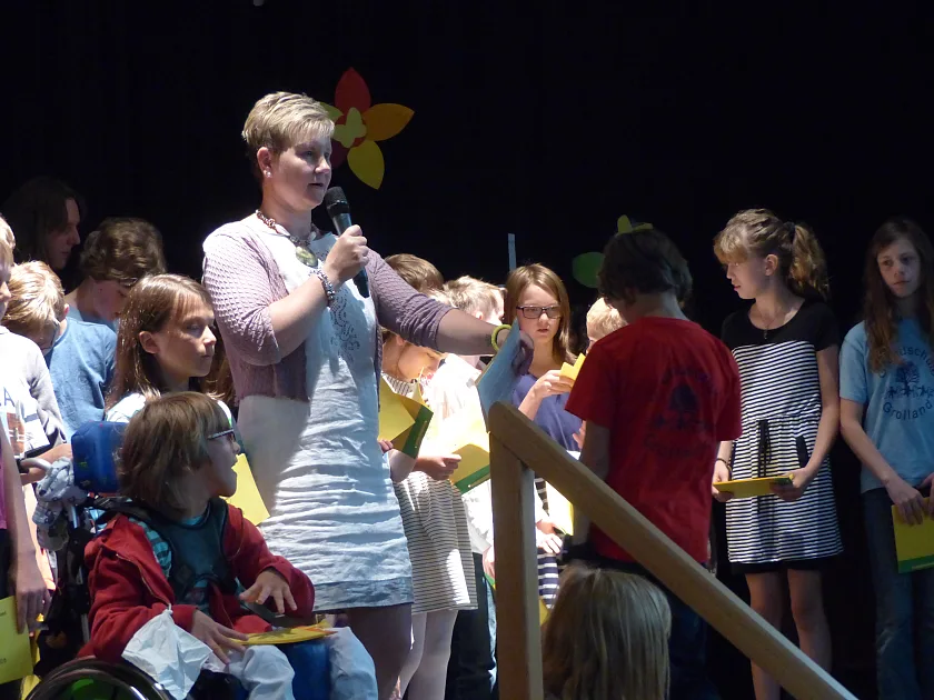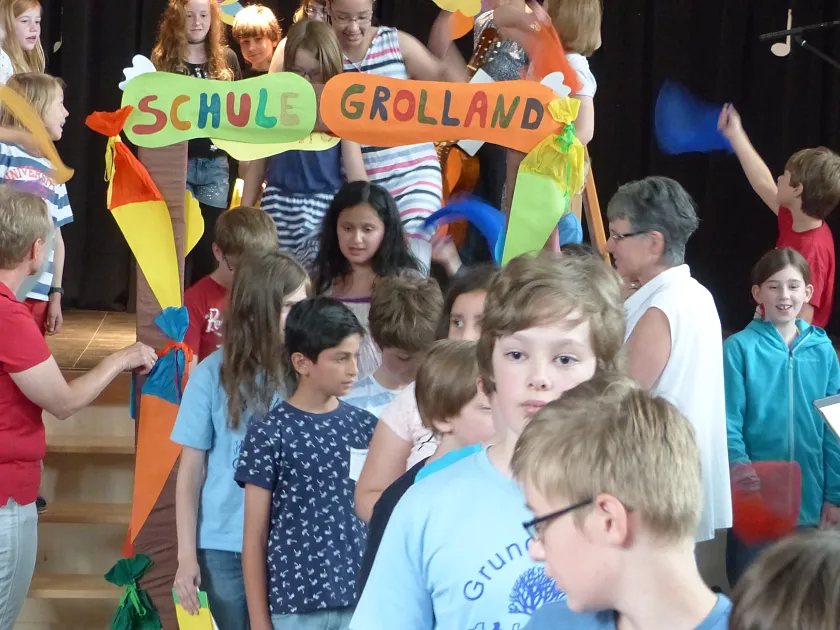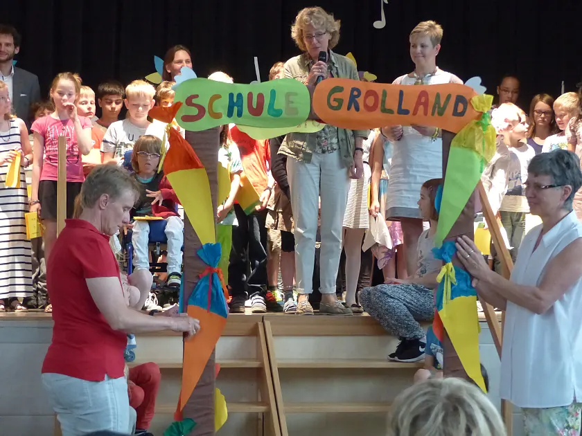 So wurden die neuen Schülerinnen und Schüler am Samstag, den 8. August von den Kindern der 2. Klassen in der Turnhalle der Grundschule Grolland herzlich begrüßt. Auch die Anders-und Einzigartigkeit eines jeden präsentierten die 2. Klässler mit dem Lied "Anders als du“.