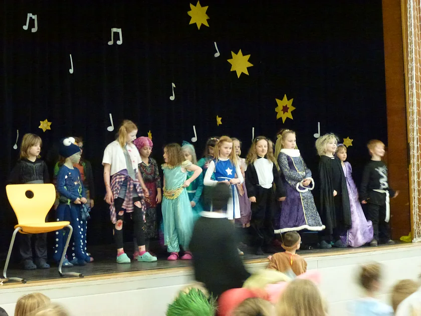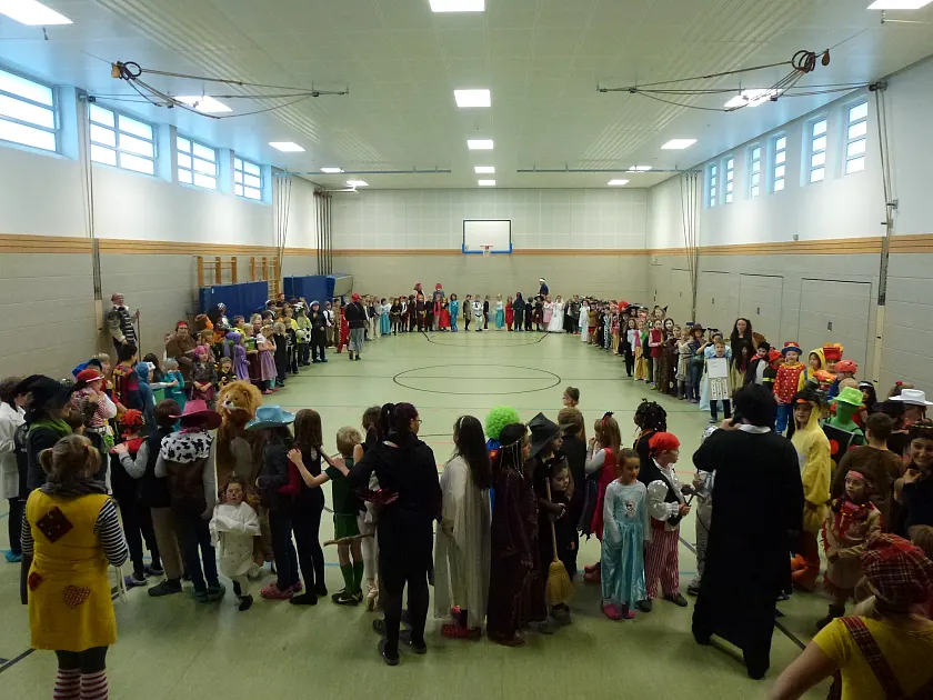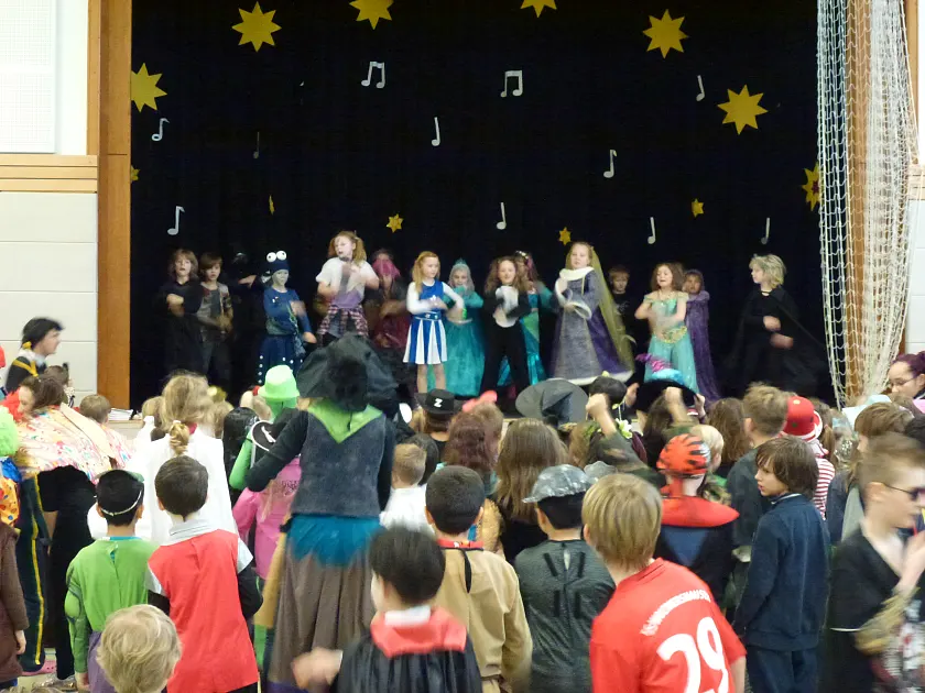 Um 11.00 Uhr gab es dann eine große Feier mit allen Klassen in der Turnhalle. Eine lange Polonaise führte in die Turnhalle und holte so Klasse für Klasse ab. In der Turnhalle wurden Lieder gesungen und getanzt. Einige Klassen hatten etwas vorbereitet und führten es auf der Bühne vor. Der Klassenlehrer der 2a - Herr Mack - führte durch das Programm und heizte die Stimmung immer wieder an.