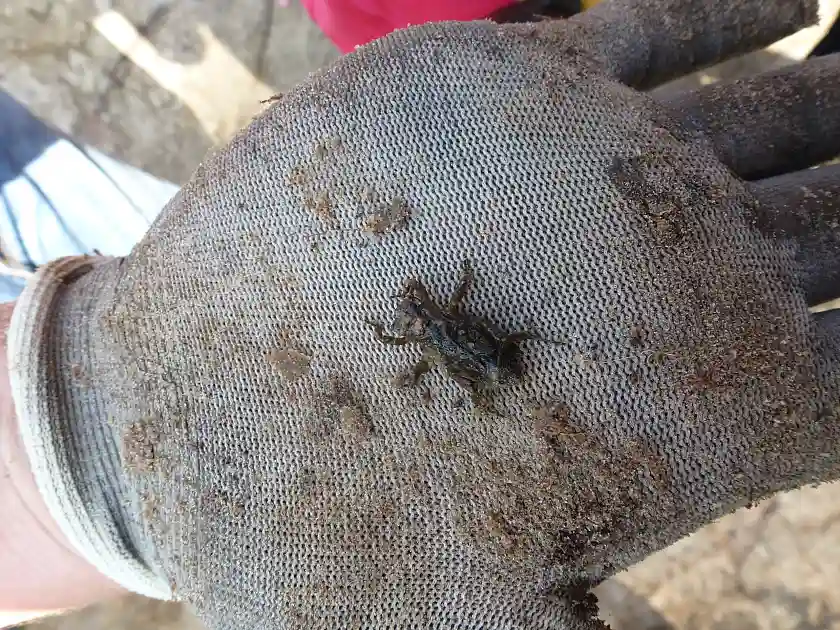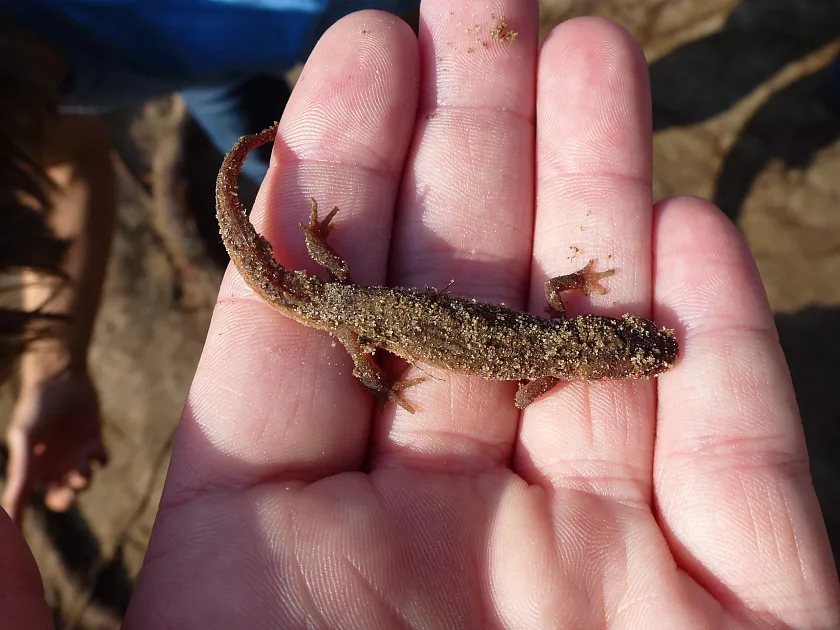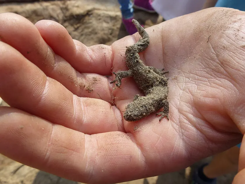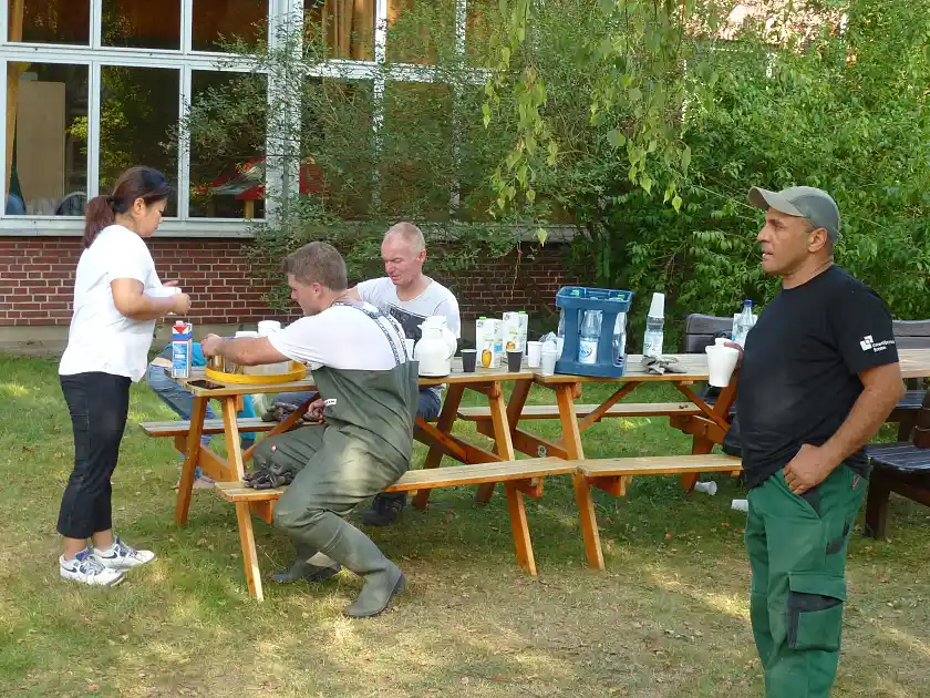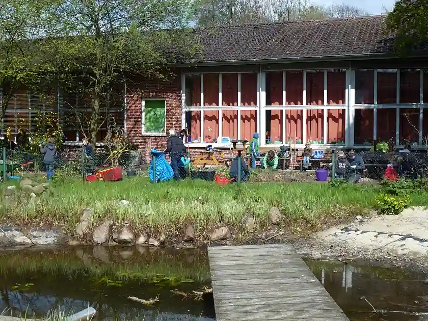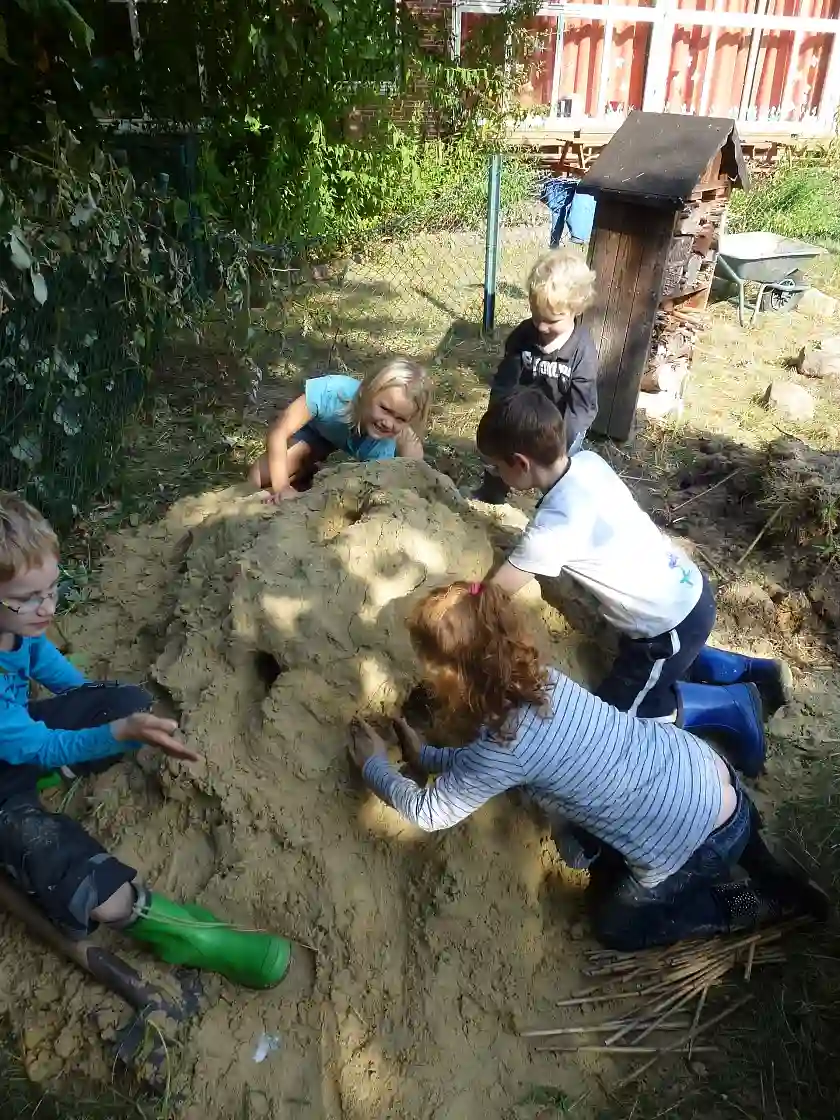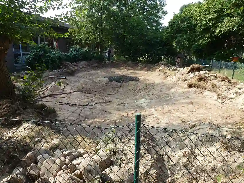Für die Kinder war es ein tolles Erlebnis. Zahlreiche Molche tauchten unter der Folie auf und es gab auch Tiere, die wir nicht bestimmen konnten. Der große Sandhaufen, der vorher aus dem Teich geschaufelt wurde diente später als großer "Buddel-Haufen". Auch das Wurzelwerk der nahestehenden Bäume und Sträucher, das sich unter der Teichfolie entlang geschlängelt hatte, war sehr interessant für alle Beteiligten.