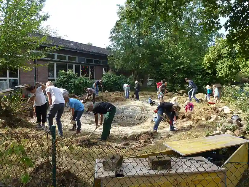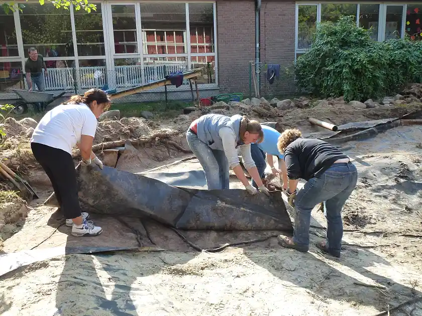Am Samstag, den 24.09.2016 versammelten sich fleißige Helfer um unseren Teich, um der Teichfolie zu Leibe zu rücken. Diese war bei einer Entschlammung im letzten Jahr kaputt gegangen und der Teich konnte sein Wasser nicht mehr halten. Da unser ökologischer Schwerpunkt und unsere Natur AG den Teich beinhalten mussten wir uns etwas einfallen lassen. Über Bingo Mittel haben wir den Zuschlag bekommen und dürfen den Teich grundsanieren. Um die Kosten hierfür so gering wie möglich zu halten, haben wir mit Hilfe von Eltern und Kindern die Teichfolie entfernt, um ihn für die Neugestaltung vorzubereiten.