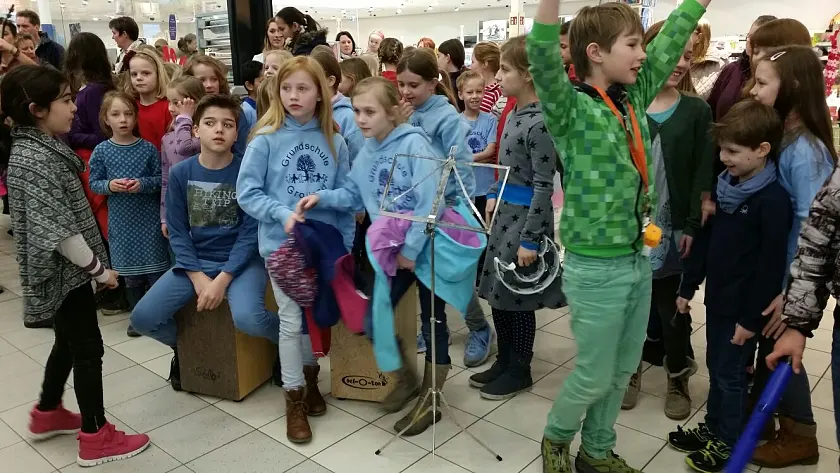 Zum 1-jährigen Jubiläum des Einkaufszentrums in der Duckwitzstraße hat uns DM herausgefordert. Es hieß "Wetten, dass Sie es nicht schaffen, am 18.03.2017 mit mindestens 25 Kindern vor DM ein Lied zu singen!". Das konnten wir uns als Musikprofilschule ja nicht nehmen lassen und organisierten das Singen.