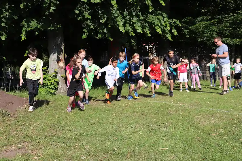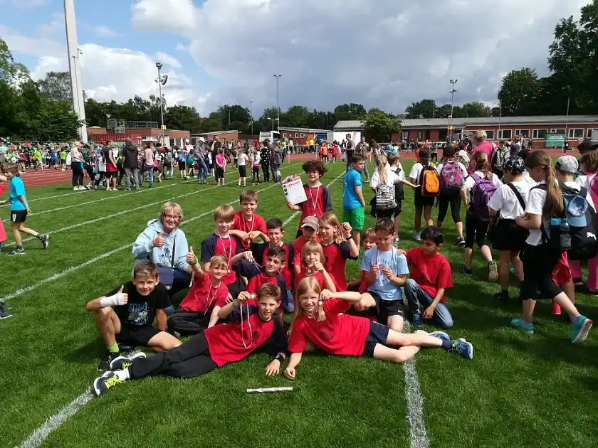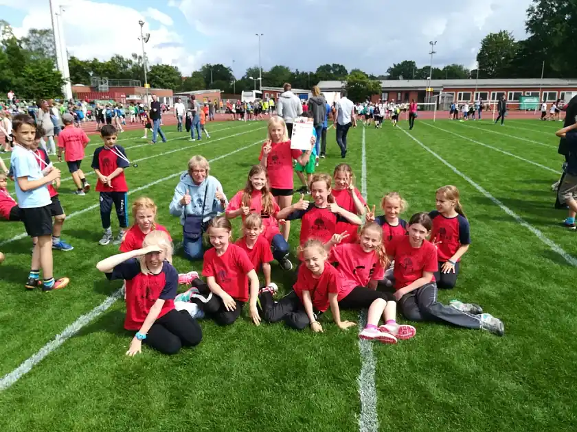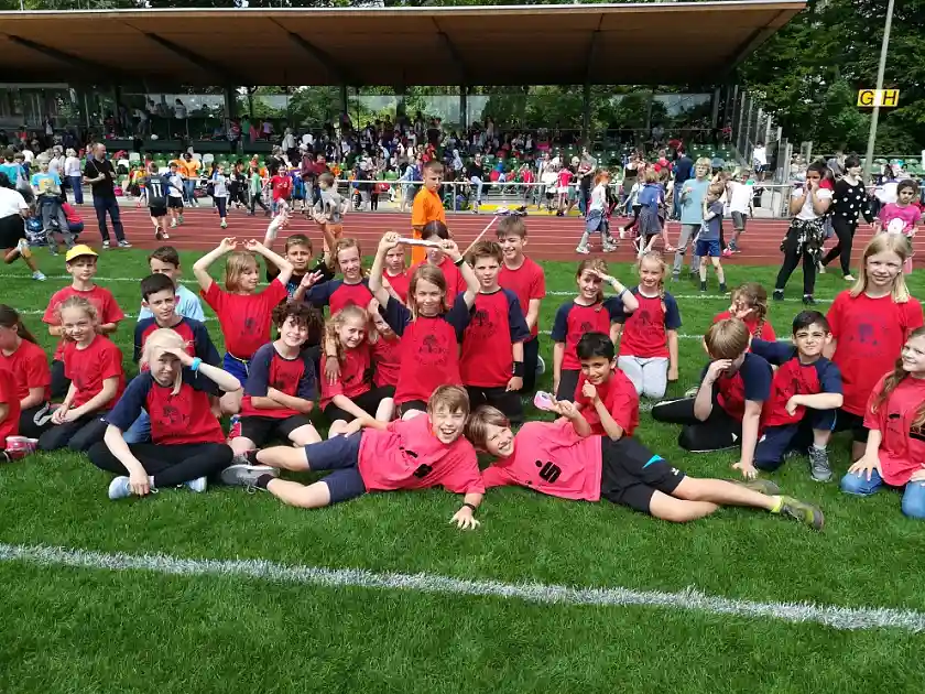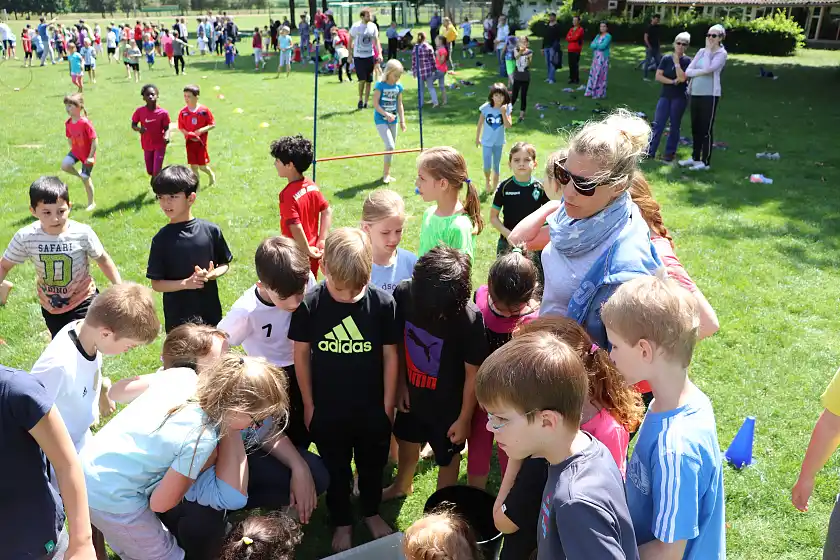 Zum Schluss gab es für alle noch eine Spaßstaffel und eine großer Abschlusskreis mit allen Kindern und Lehrkräften der Schule. Eine riesige La Ola Welle beendete das Sportfest.