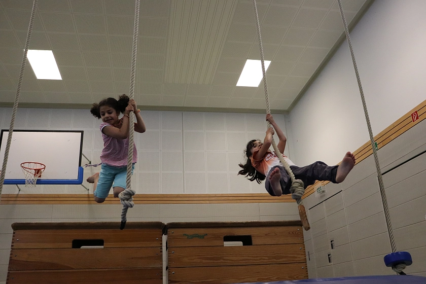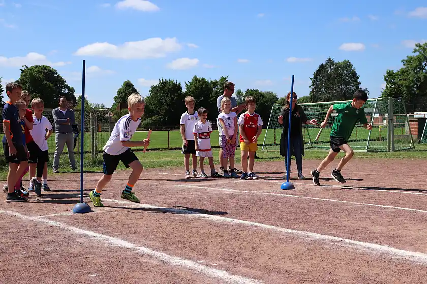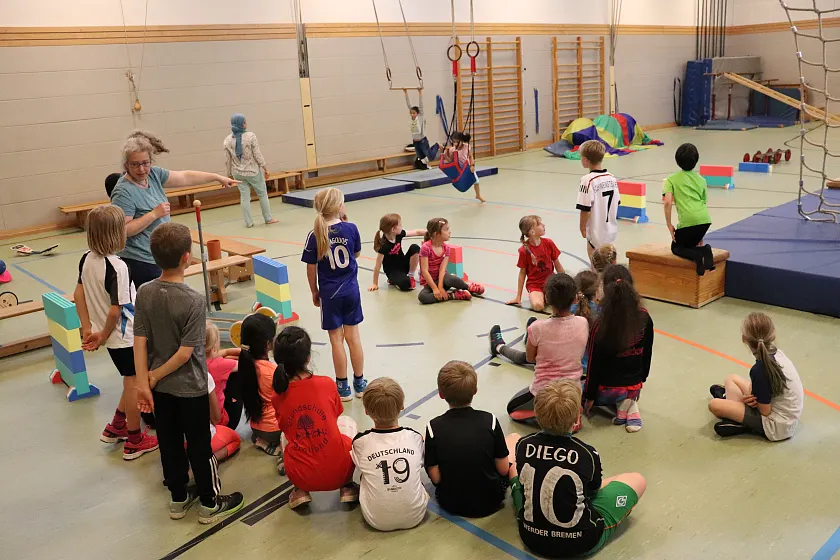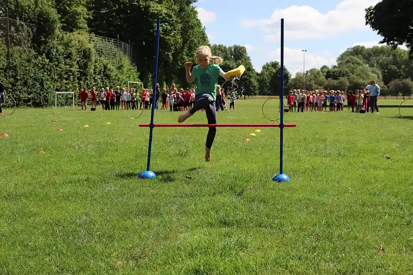 Die Kinder feierten wieder Erfolge in den Disziplinen Weitsprung, Werfen, Sprint, 800m Lauf und Staffellauf. Diesmal war auch in der Sporthalle eine große Bewegungslandschaft aufgebaut. Die neuen Geräte, die dort eingeweiht wurden, haben wir aus Gewoba-Geldern bezahlt.