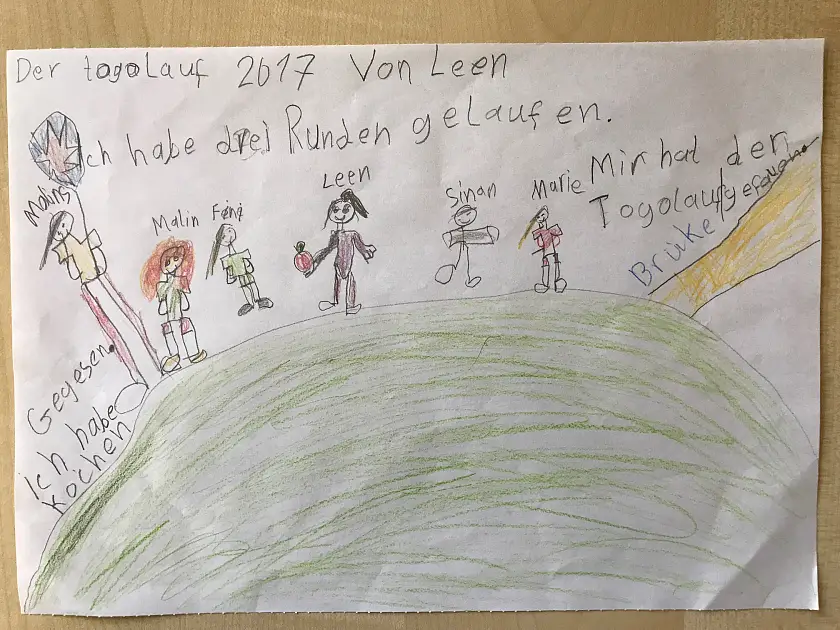 Der Sponsorenlauf war für mich schön, weil ich drei Runden gelaufen bin. Ich wäre das eigentlich nicht gelaufen, aber für die Kinder in Togo bin ich gerne gelaufen. Und die Stempel haben mir gefallen, weil man sehen konnte, wie viele Runden man gelaufen ist. Und nach dem Sponsorenlauf war unser schönes Schulfest. (Maja, 2b)