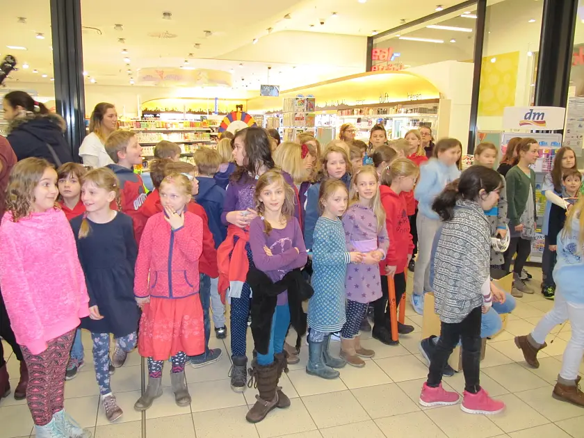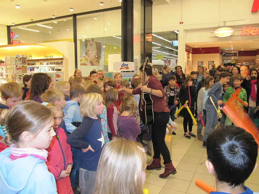 Am Samstag, den 18.03.2017 versammelten wir uns dann vor dem Einkaufszentrum. Zuerst sah es nicht so gut aus und es kamen nur langsam vereinzelte Kinder mit ihren Eltern. Um kurz nach 12 Uhr waren wir dann aber sage und schreibe ca. 50 Kinder, die unter Begleitung von Helga Felkl-Witt zwei Lieder sungen und ganz DM lahm legten.