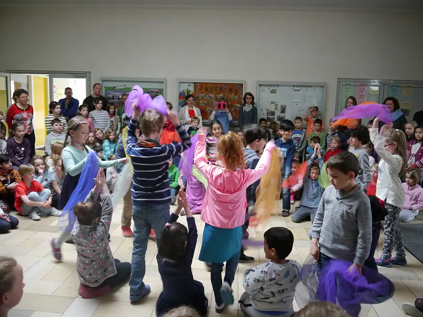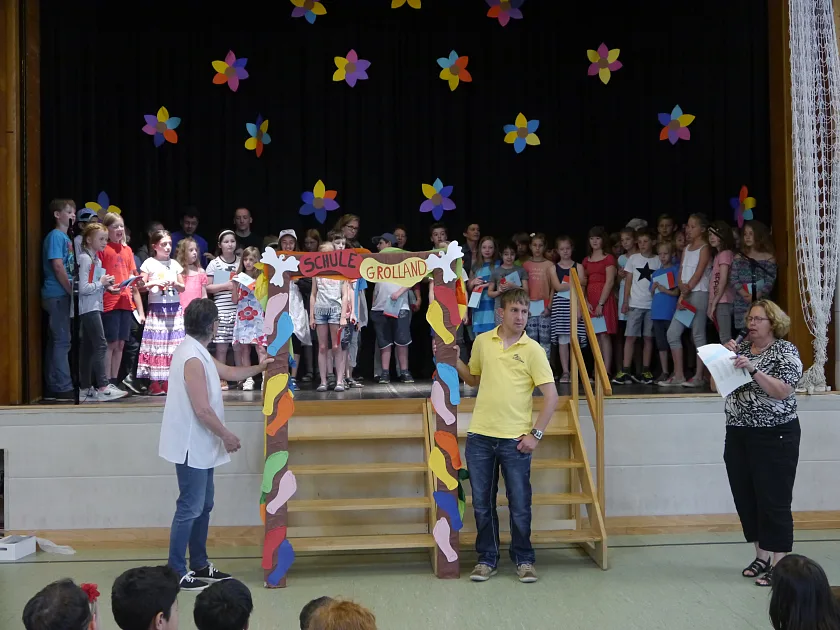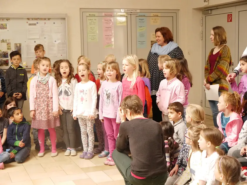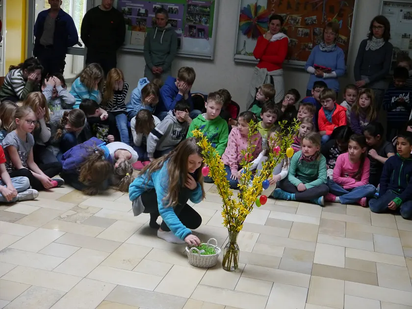 Die Kinder der GS Grolland starteten am letzten Schultag vor den Osterferien gemeinsam das Frühlingsfest in der Eingangshalle.