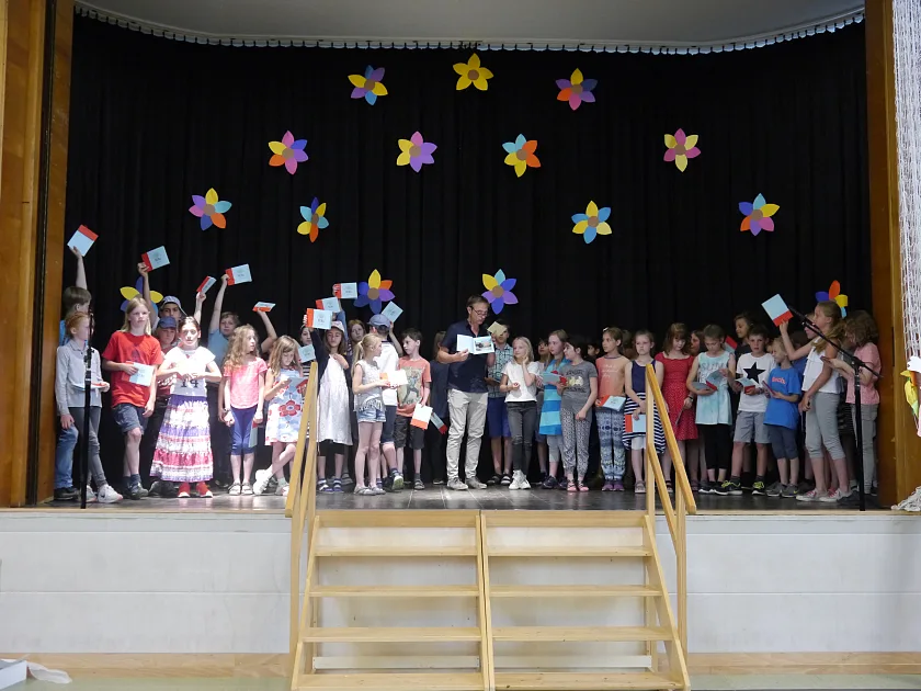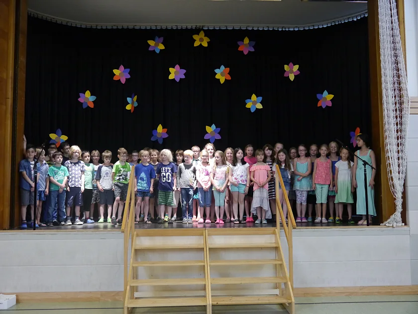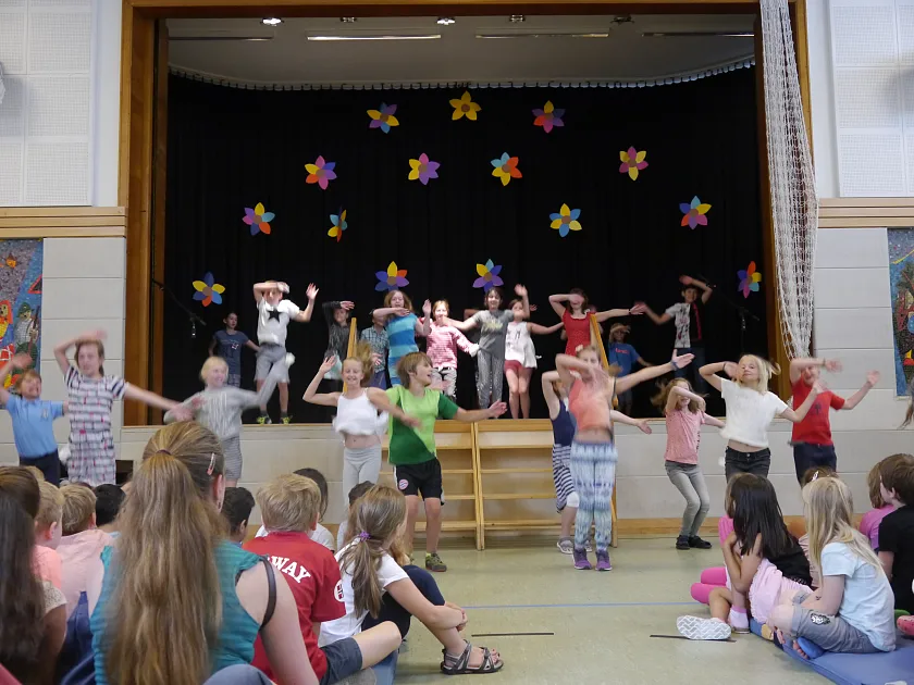 Die 4. Klassen haben sich auf ihre Art von der Schule verabschiedet. Die 4a hat einen Rap vorgesungen und die 4b hat einen Tanz vorgeführt.