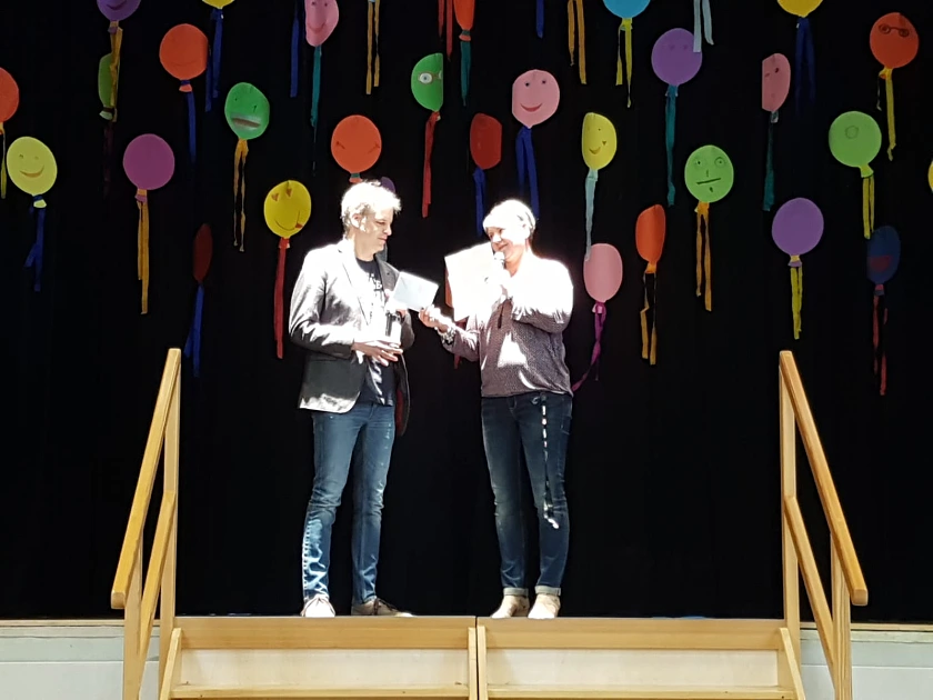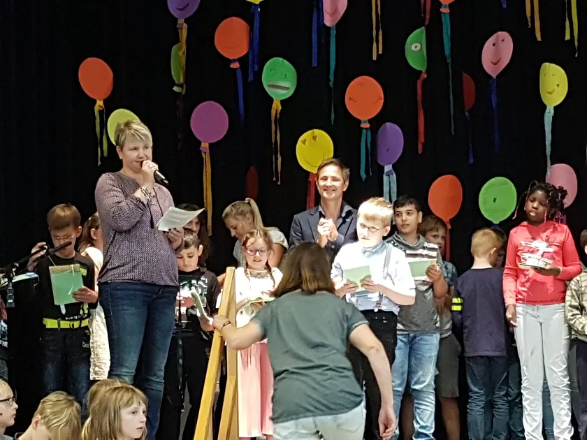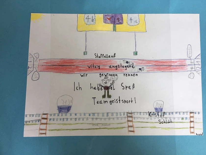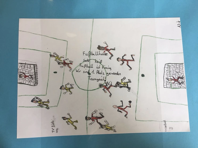 Die Klasse 4b nahm am diesjährigen 65. Europäischen Wettbewerb teil. Ihre Arbeit in der Kategorie "Freundschaft und Wettstreit" wurde auf Bundesebene ausgezeichnet. Über 200 Kinder hatten sich an dem Wettbewerb beteiligt. Eine tolle Leistung, die auch belohnt wurde. Neben einer Urkunde erhielt die 4b auch ein Tischhfußballspiel.