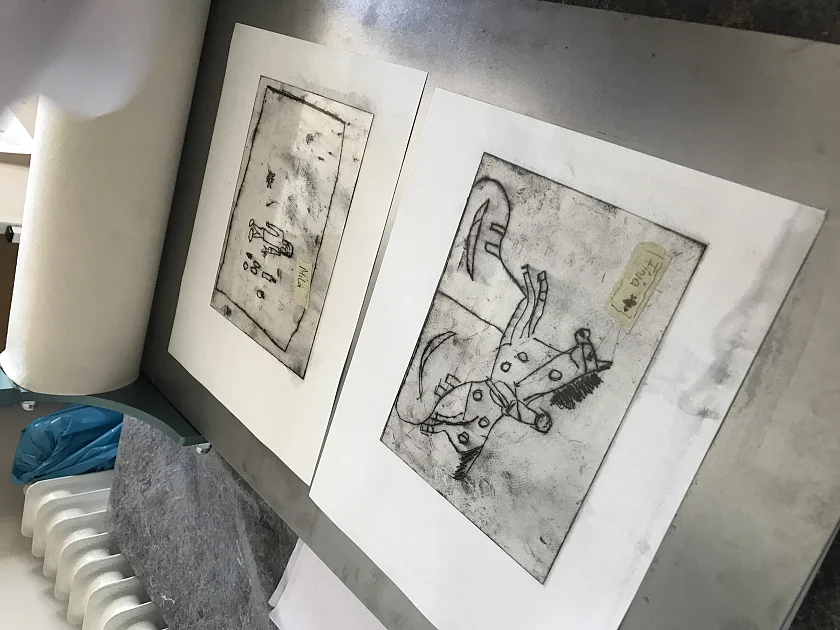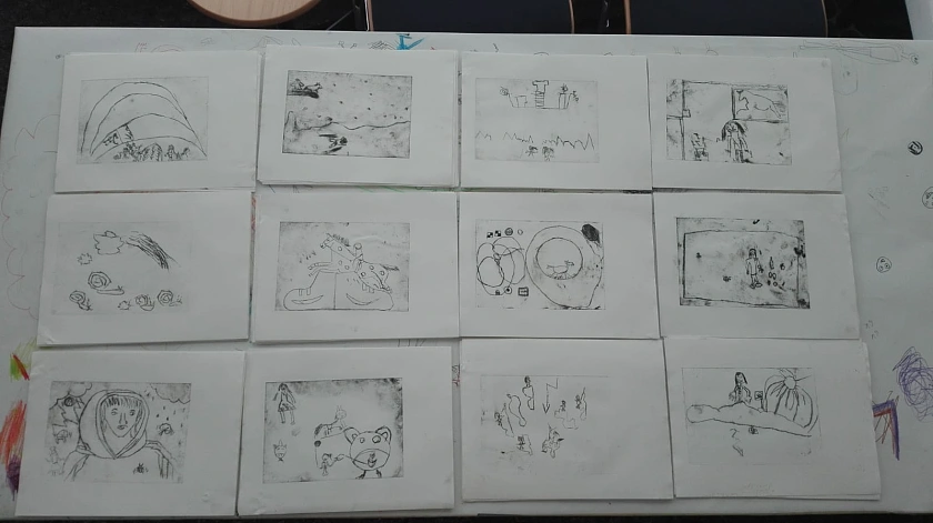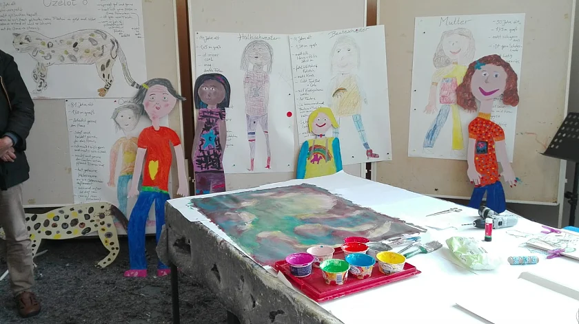 Die Schülerinnen und Schüler der 3a haben in 2 Halbgruppen jeweils 2 mal die Woche 3 Wochen lang an ihrem Buch gearbeitet. Dabei ging es um eine Familie, die von einem Phantasieort zum anderen zieht, weil sie sich an dem einen Ort nicht mehr wohlfühlt. Wir haten Orte wie "Als wir im Bett wohnten" oder "... hinter den Wolken wohnten" oder "...auf einer Cap." Dabei konnten die Kinder ihrer Phantasie freien Lauf lassen. Zu der Familie gehörten 4 Familienmitglieder, die auch nahe zu lebensgroß aus Holz hergestellt wurden. Alle hatten verschiedene Eigenschaften, die auch immer ein bisschen verrückt waren. Zu der Geschichte wurde eine Kaltnadelradierung erstellt. Die Druckmaschine, die man dazu benötigt ist durch Spendengelder der PSD Bank in unseren Besitz über gegangen. So ist gesichert, dass wir auch alleine solche Projekte durchführen können.