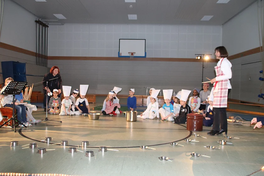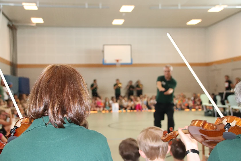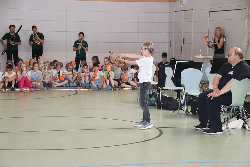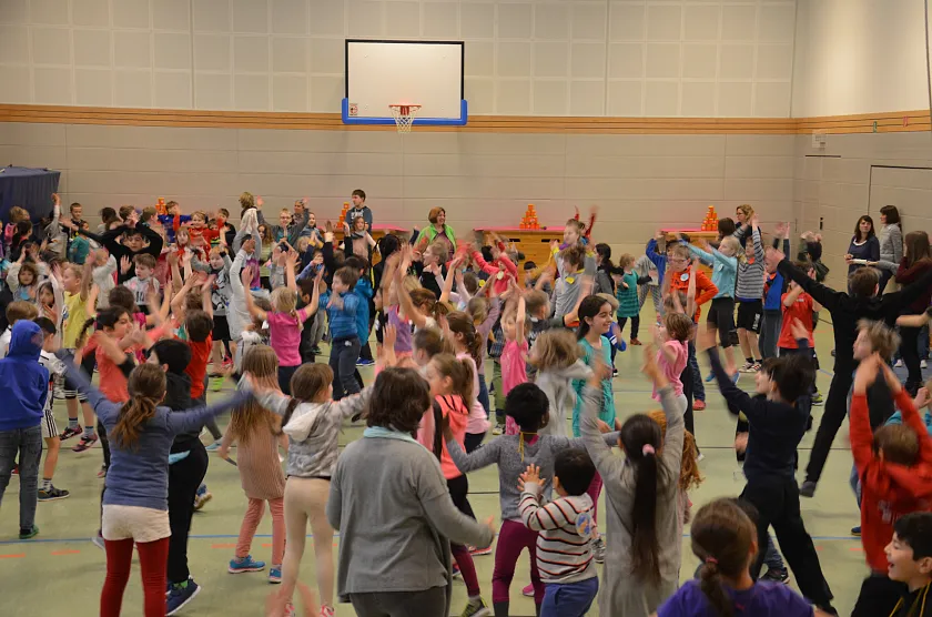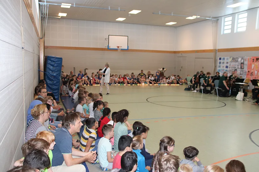 Nach einer Pause traf sich die ganze Schule wieder in der Turnhalle, natürlich mit den Instrumenten. Wir wurden in Instrumentengruppen eingeteilt und Herr Gartelmann dirigierte die einzelnen Gruppen bis alle zusammen spielten. Zum Schluss durften auch einzelne Kinder dirigieren. Es war beeindruckend, was in so kurzer Zeit auf die Beine gestellt wurde.