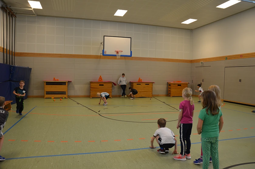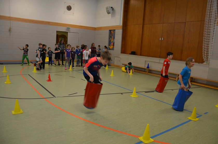 In der Sporthalle ging es ganz rasant her. In der einen Hälfte wurde um die Wette "sackgehüpft" und in der anderen Hälfte konnte man Dosen abwerfen.