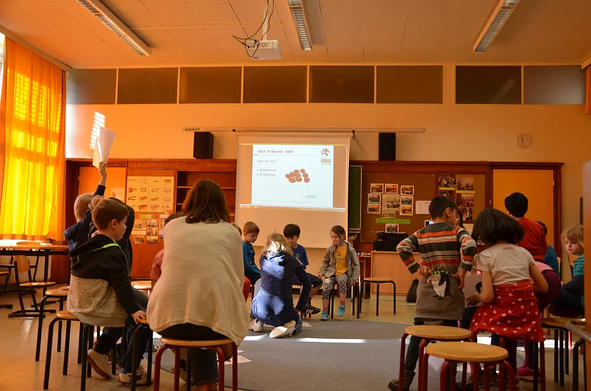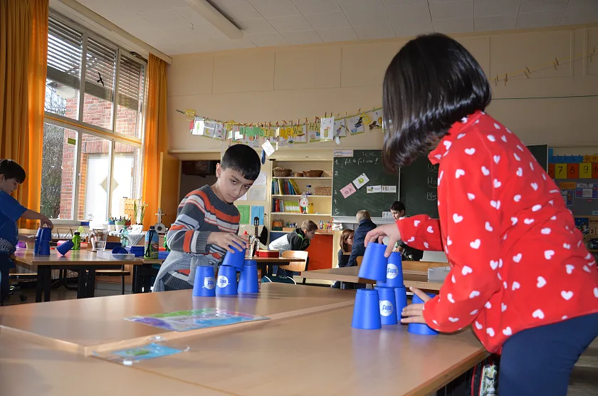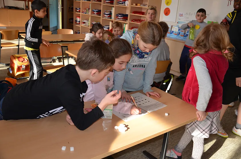 Den ganzen Vormittag haben die Klassen diese sechs Stationen durchlaufen, bei denen es sowohl um geistige, als auch um körperliche Fitness ging. Die Kinder mussten Gerüche erkenne und sie mussten abgeschätzt, wie viele Zuckerwürfel wohl in welches Lebensmittel passt. In einer Station mussten sie Plastikbecher so schnell es geht zu einer Pyramide aufeinander stapeln und wieder abbauen (Stacking). Im Ernährungsquiz wurden Fragen zur Ernährung geklärt und auf dem Flur davor suchte eine Klasse der nach der richtigen Zahl, die sie zuvor errechnen mussten.