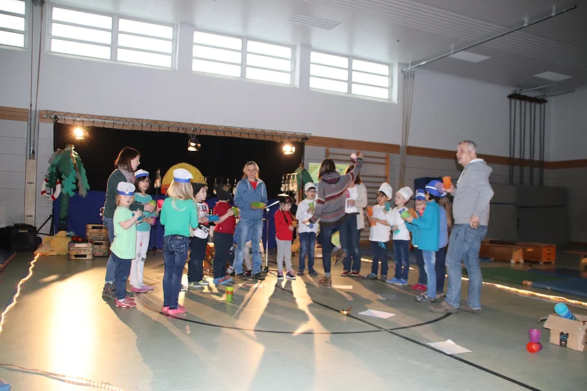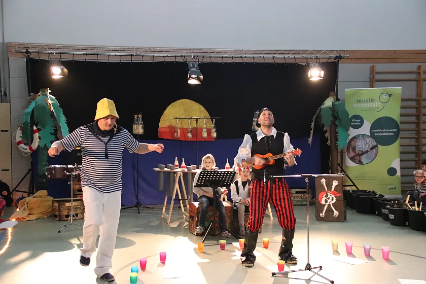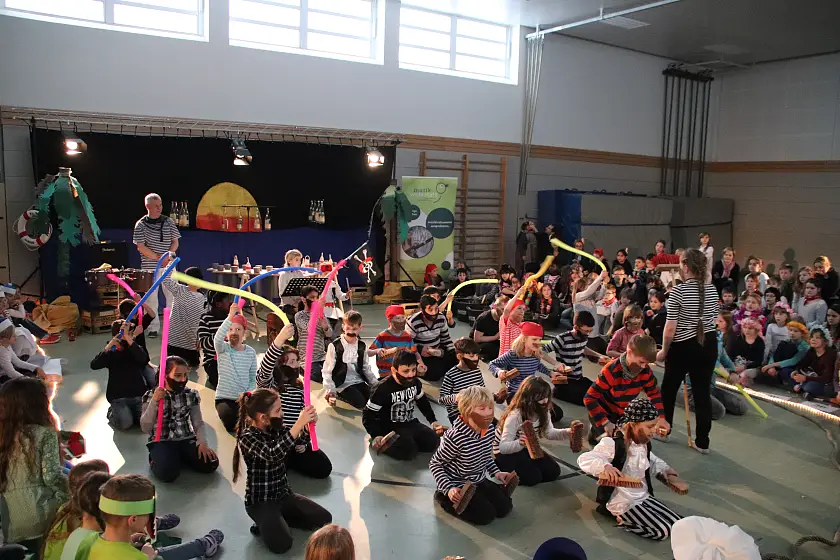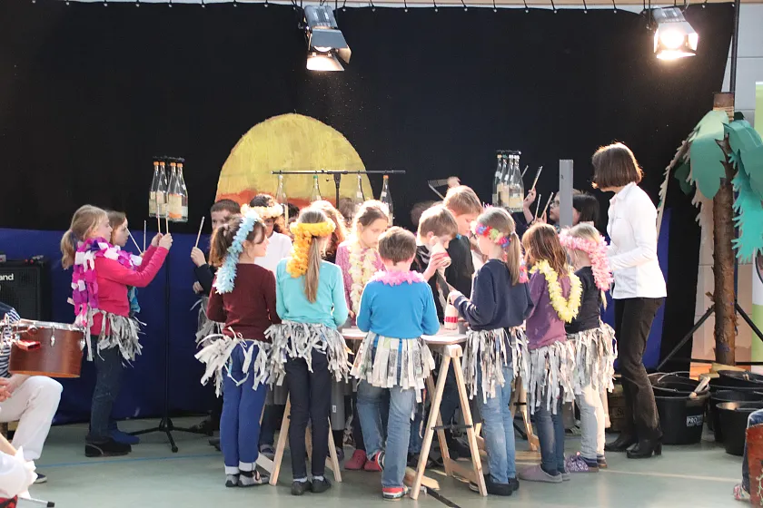 Am letzten Tag vor den Osterfreien hatten wir in Kooperation mit der Musikwerkstatt der Beremer Philharmonikern einen großen Auftritt in der Sporthalle. "Captain Stomp auf großer Fahrt" war das Thema. Zwei Wochen zuvor hatten die Lehrkräfte ein Fortbildung zu dem Thema. Jede Klasse übernahm ein Stück und es wurden Rhythmen ausschließlich auf Alltagsgegenständen, wie Z. B. Flaschen, Abflussrohren und Eimern gespielt.Ein Vormittag kamen Marko Gartelmann und Matthias Endrup vorbei und gaben den einzelnen Klassen noch mal den letzten Feinschliff. Am 16.03.2018 war es dann soweit. Zunächst gab es eine große Generalprobe, bei der alle Klassen noch mal ihren Auftritt Proben konnten. In der Sporthalle war ein großes Schiff als Bühne aufgebaut. Nach der Generalprobe und nach einer kleinen Pause fand dann die Aufführung statt, die wunderschön war und gut geklappt hat.