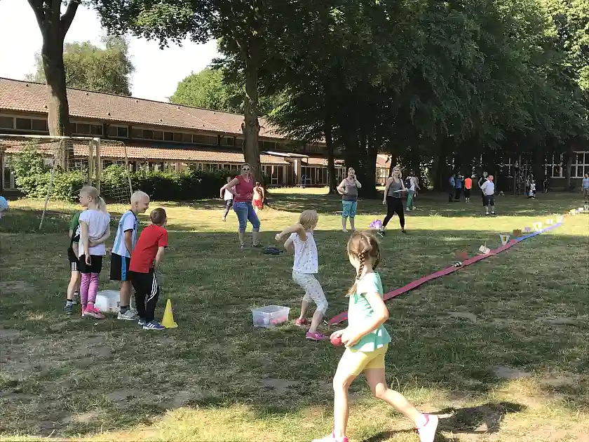 Am Freitag den 08.06.2018 hatten wir unser diesjähriges Sportfest bei über 30ºC. Das Sportfest wurde mit einem großen Kreis aus allen Klassen und helfenden Eltern eröffnet.
