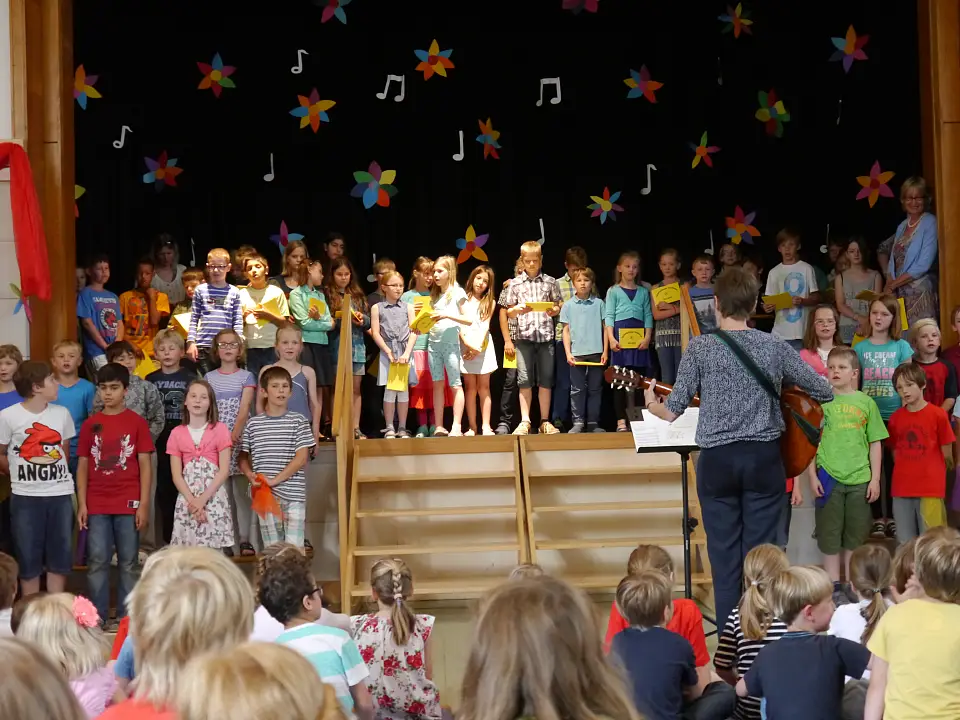 4. Klassen stehen auf der Bühne zur Verabschiedung.
